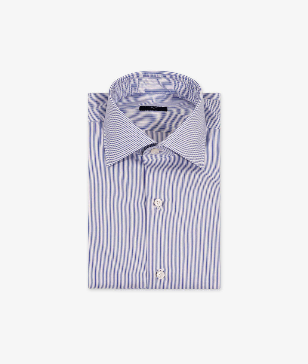 This sartorial blue and white striped shirt embodies the essence of classic elegance. Crafted from high-quality cotton, it features a refined spread collar and the meticulous attention to detail typical of fine craftsmanship. Its timeless design and tailored fit make it perfect for both formal occasions and prestigious business looks. An essential staple for the masculine wardrobe, combining understated style with uncompromising comfort.