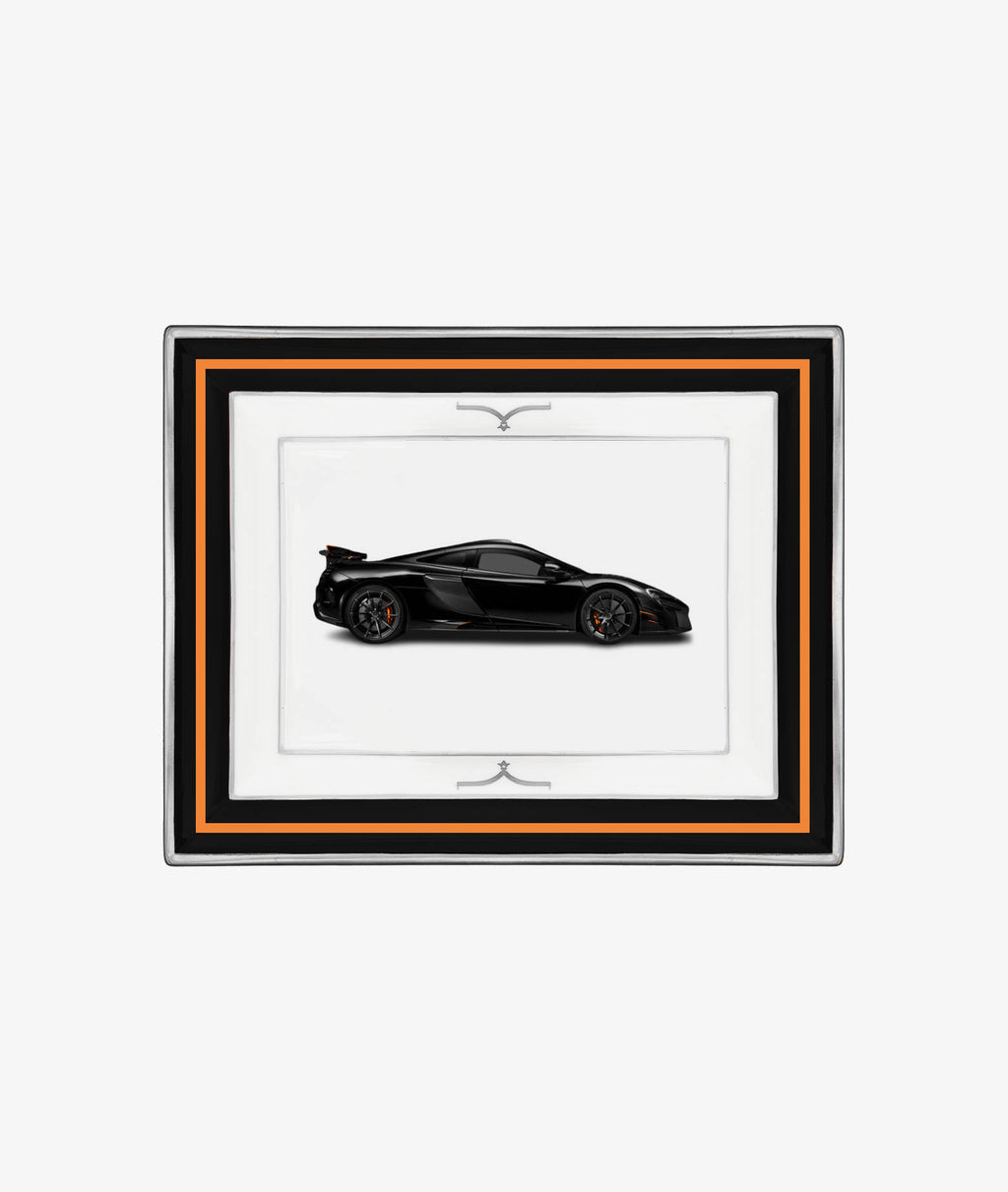 This personalized pocket emptier, made of Limoges French porcelain and hand-painted by LARUSMIANI artisans in Milan, features a stunning black Hypercar with orange details.